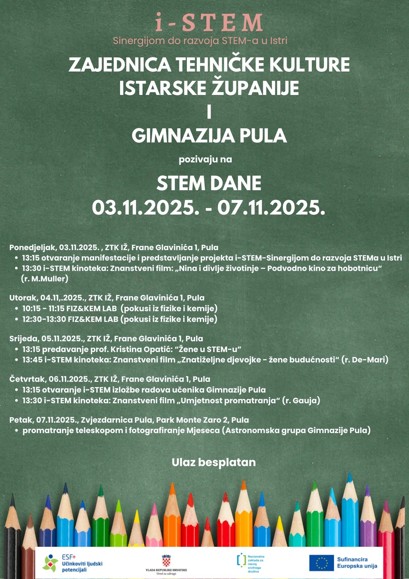 Zajednica tehničke kulture Istarske županije i Gimnazija Pula u sklopu Aktivnost 4.1. Promocija STEM-a na javnim mjestima organiziraju javnu manifestaciju i-STEM dani koji će se održati od 4. do 8. studenoga 2025. u Puli. Sudionike očekuje pet dana ispunjenih znanstvenim pokusima, filmovima i promatranjem neba, a sve s ciljem popularizacije znanosti, tehnologije, inženjerstva i matematike među mladima.