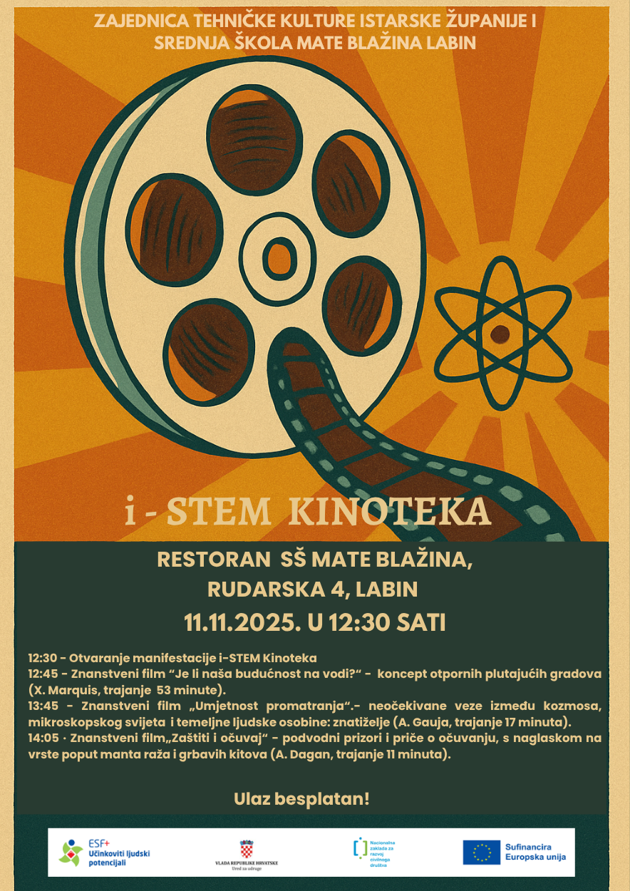 Zajednica tehničke kulture Istarske županije, u suradnji sa Srednjom školom Mate Blažine Labin, u sklopu projekta „i-STEM – Sinergijom do razvoja STEM-a u Istri“ (SF.2.4.06.04.0056) s ponosom najavljuje javnu manifestaciju - iSTEM Kinoteka!
