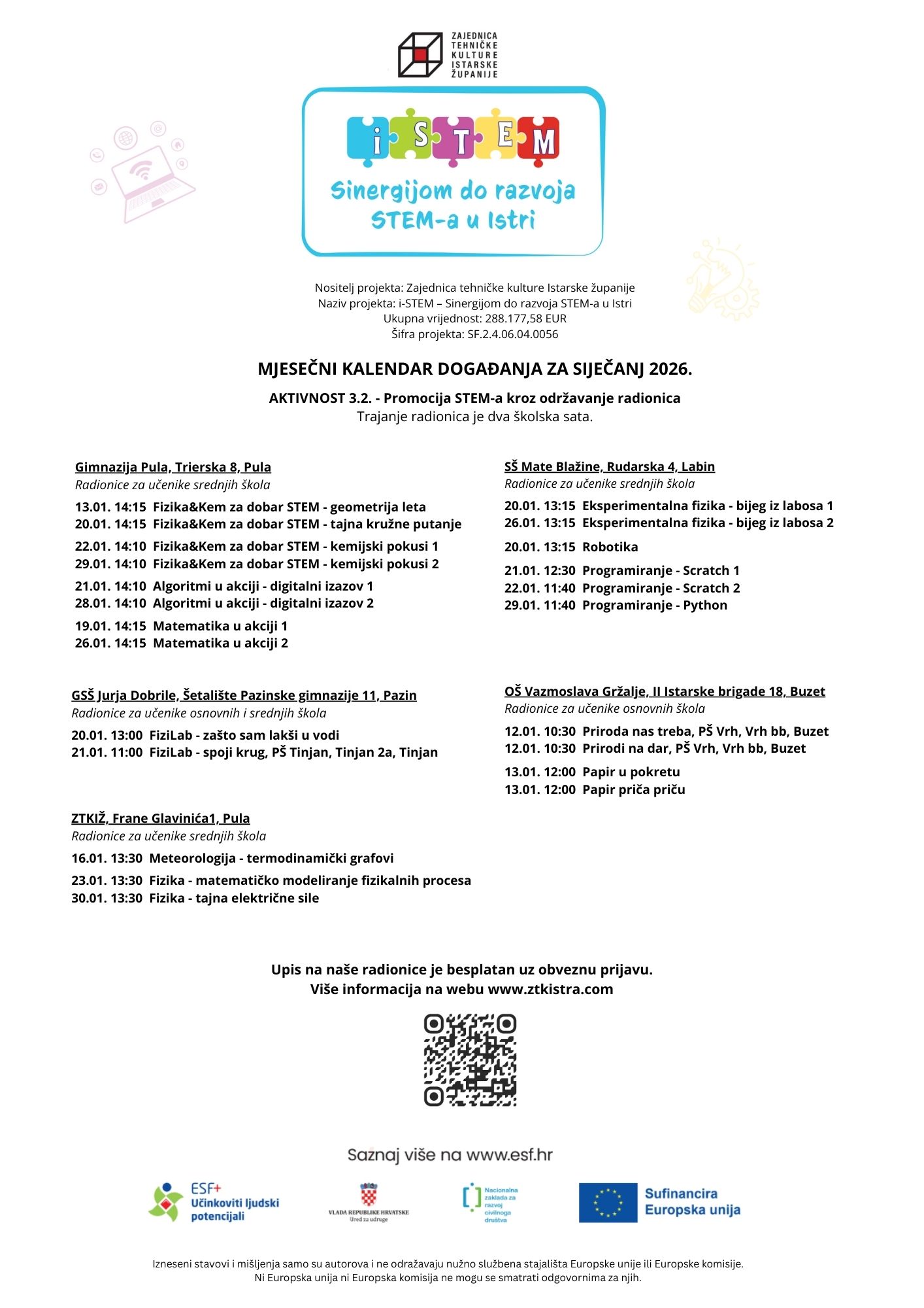 Već u prvom mjesecu nove godine očekuju te radionice prepune znatiželjnih, poučnih i zabavnih STEM izazova. Kroz aktivnosti 3.2. pripremili smo raznovrstan program u kojem možeš stvarati, istraživati, eksperimentirati, družiti se i pritom naučiti nešto novo – na zanimljiv i praktičan način.