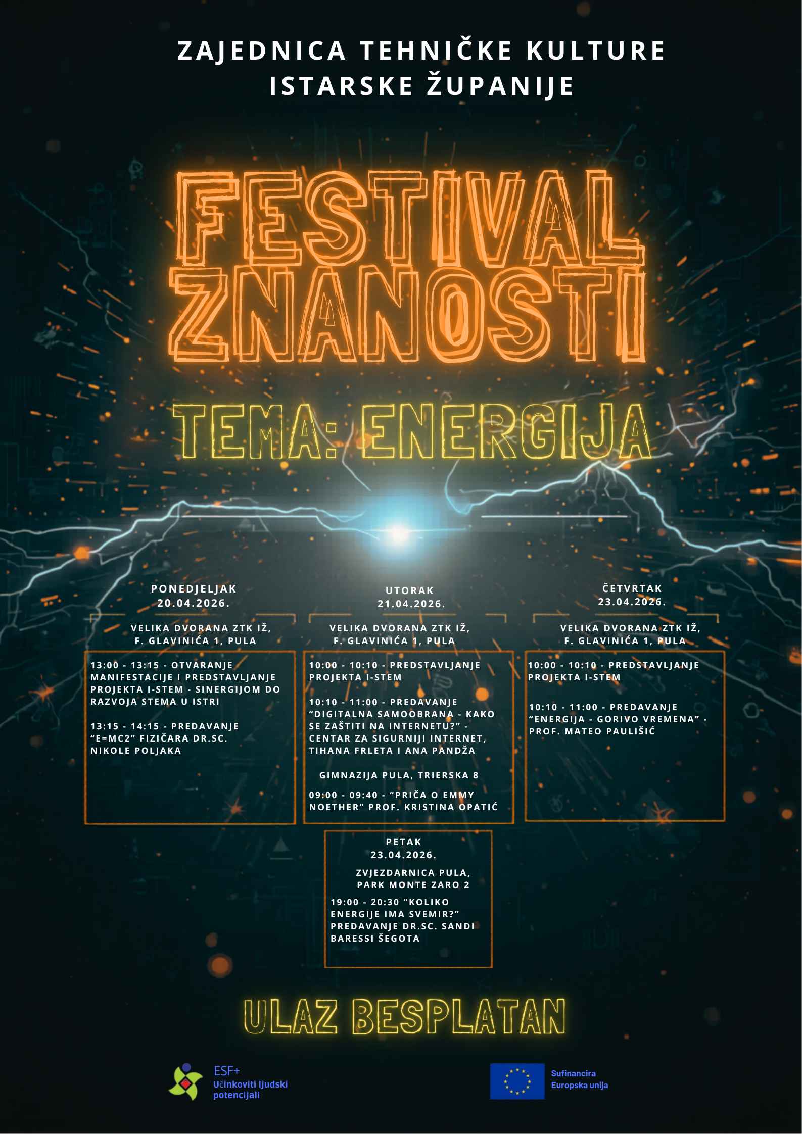 Zajednica tehničke kulture Istarske županije i Gimnazija Pula, u sklopu projekta „I-STEM – Sinergijom do razvoja STEM-a u Istri“ (SF.2.4.06.04.0056), pozivaju vas na uzbudljivo izdanje Festivala znanosti! Od 20. do 24. travnja 2026., Pula postaje središte znanstvenih istraživanja kroz predavanja vrhunskih stručnjaka na tri lokacije: Zajednica tehničke kulture Istarske županije, Gimnazija Pula i Zvjezdarnica Pula.