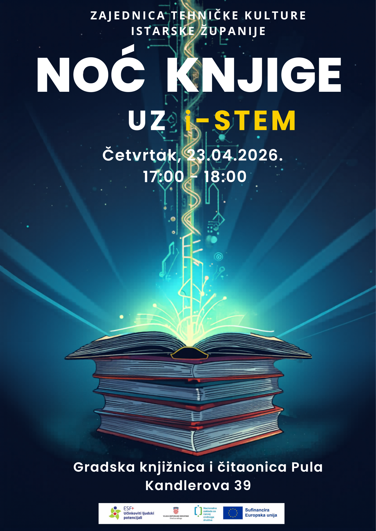 U sklopu projekta „i-STEM – Sinergijom do razvoja STEM-a u Istri“ (SF.2.4.06.04.0056) koji se sufinancira iz Europskog socijalnog fonda plusa, pozivamo vas u četvrtak, 23.04.2026. u Gradsku knjižnicu i čitaonicu Pula na interaktivno poslijepodne gdje spajamo znanje, inspiraciju i kreativnost.